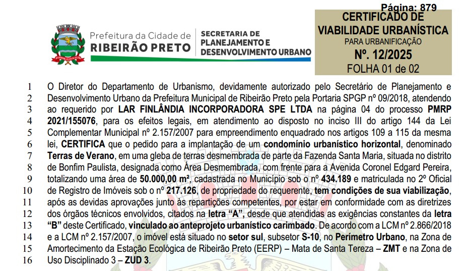 temos o prazer de comunicar a todos que, neste mês, nossa empresa alcançou mais um passo importante em seus projetos: a obtenção da Certidão de Viabilidade Urbanística do empreendimento Terras de Verano.