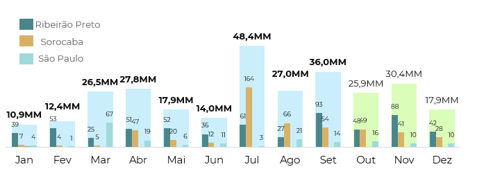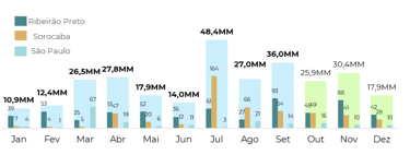 em agosto, Ribeirão Preto e Sorocaba tiveram retração, mas se recuperaram em setembro, aproximando-se de suas médias históricas. São Paulo manteve estabilidade acima da média de 57, encerrando setembro em 81 pontos. Sertãozinho teve o melhor desempenho, crescendo de 60 em julho para 180 em setembro, superando sua meta de referência.
