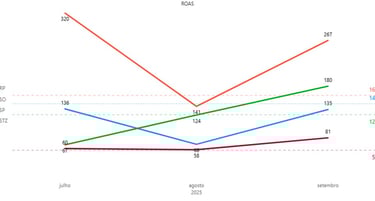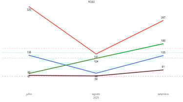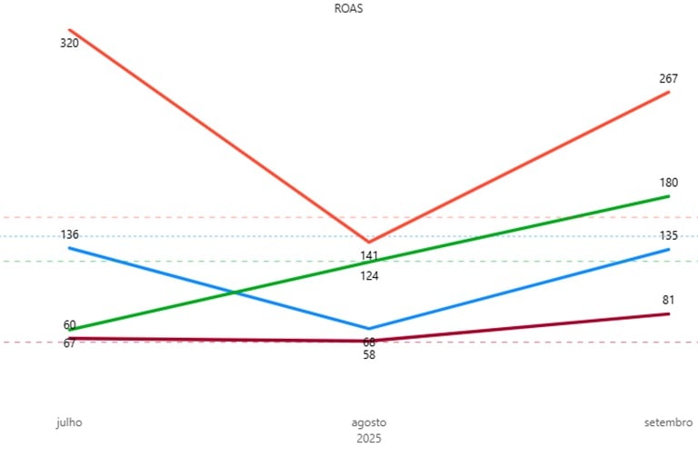 o ROAS mede o retorno obtido em vendas para cada real investido em mídia. As linhas horizontais indicam a meta de crescimento de 10% em relação ao ROAS registrado em 2024.