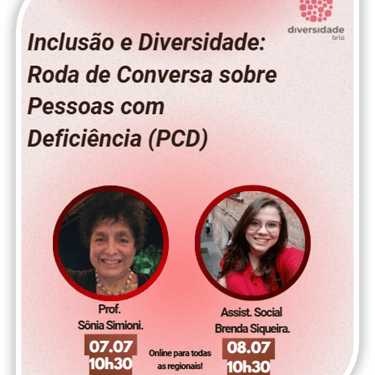 no mês de julho, recebemos a Prof. Sônia e a Assistente Social Brenda para um bate-papo sobre os desafios que as pessoas com deficiência enfrentam no mercado de trabalho e como podemos apoiá-las para que se sintam parte e integradas!