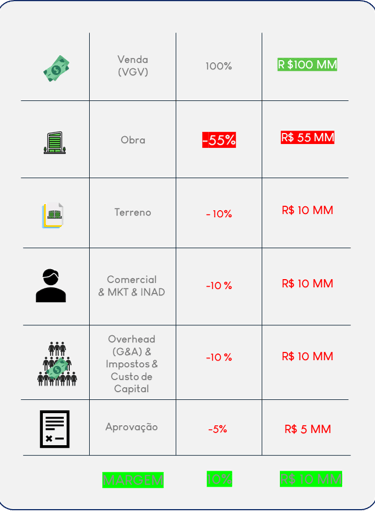 obra representa 55% de nossa viabilidade, podendo chegar em alguns casos a mais de 60% do negócio. Por isso conceber projetos em áreas maiores ajuda a diluir as despesas indiretas e por consequência diminuir a representatividade deste custo, por isso pensar em como tornar o custo do metro quadrado da área privativa menor nos possibilitaria grandes resultados. Um exemplo disso seria, se o custo do m² da área privativa desta viabilidade fosse R$ 4.600 e por algum motivo passasse a ser R$ 4.100 (redução de 10% do custo), a engenheira deixaria de representar 55% do custo e passaria a representar menos de 50%, aumentando em mais de 5% na margem do empreendimento.