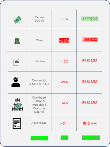 Valor Máximo a Ser Pago no Terreno = (Preço Geral De Vendas) - (Custo para Incorporar, Administrar, Construir) – (Margem 10%)