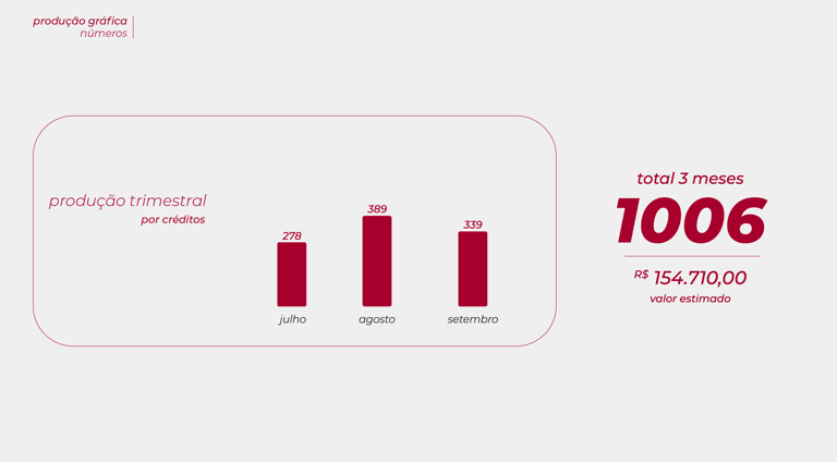 a mensuração de créditos nas demandas de design nos permite entender, de forma clara, o valor que estamos gerando para a brio. Cada peça criada possui um valor estimado de mercado, e ao contabilizarmos todas as entregas, conseguimos visualizar quanto de “preço” está sendo gerado internamente, traduzindo em números o retorno do nosso trabalho. Assim, conseguimos demonstrar quanto a brio economiza ao ter um time de design interno, fortalecendo a comunicação e gerando lucro indireto para a empresa.