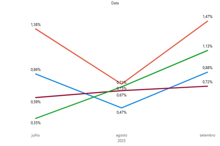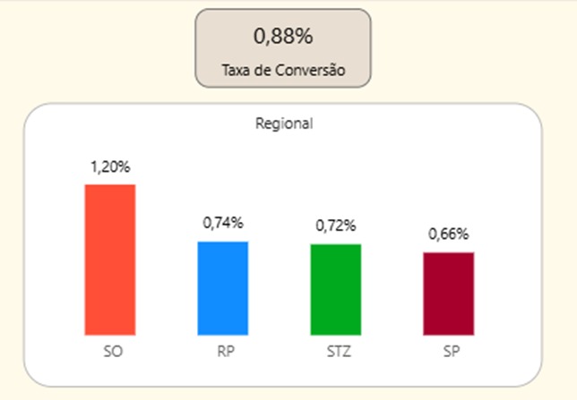 a taxa de conversão indica a proporção de vendas sobre o número de leads gerados, sendo 1% o padrão ouro de mercado. No trimestre, a média das quatro regionais foi de 0,88%. Ribeirão Preto e Sorocaba caíram em agosto, mas se recuperaram em setembro. São Paulo e, especialmente, Sertãozinho se destacaram — esta última evoluiu de 0,35% em julho para 1,13% em setembro, superando a média de mercado.