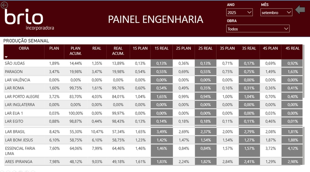 o Painel Engenharia da brio Incorporadora apresenta a evolução da produção semanal das obras em andamento, permitindo o acompanhamento detalhado do planejamento e da execução real.