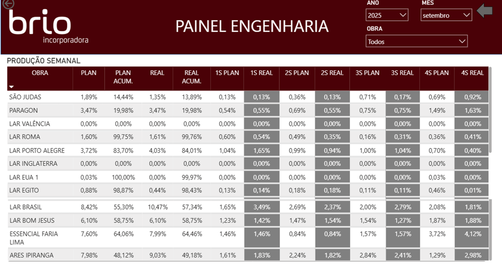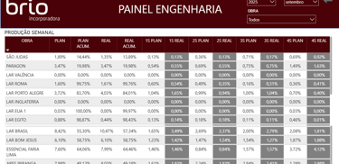 o Painel Engenharia da brio Incorporadora apresenta a evolução da produção semanal das obras em andamento, permitindo o acompanhamento detalhado do planejamento e da execução real. Os indicadores exibem o percentual planejado e realizado para cada empreendimento, além dos acumulados ao longo do mês, possibilitando a análise de desempenho, identificação de desvios e ajustes na gestão.